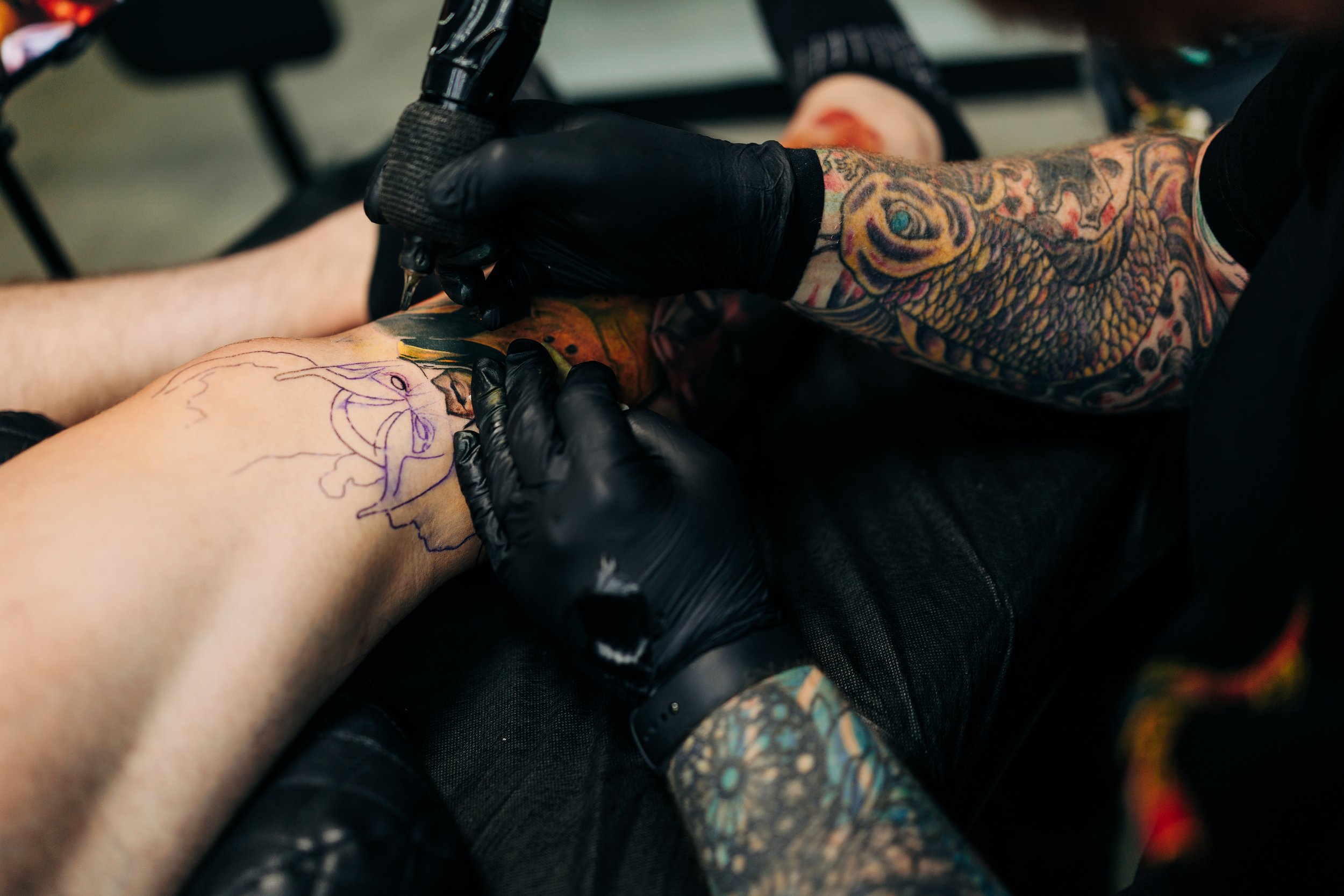 Tattoo artist Timmy Grounds works on a detailed Marvel-themed leg sleeve, adding depth and color to the design. The stencil outlines of iconic comic imagery are visible on the client’s leg as Timmy layers rich tones and shading. His tattooed forearm and black gloves frame the in-progress piece, capturing the focus, precision, and artistry behind large-scale tattoo work.